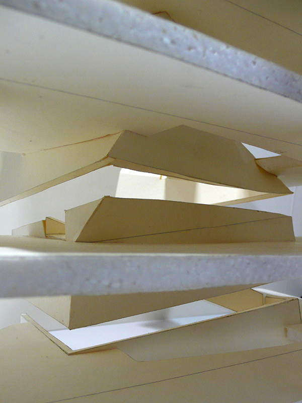The project was designed and modeled in Rhino, rendered with VRay, and exported to AutoCAD for 2d drawings. Models were made in-house, mostly by hand, except for the stair core, which was 3d printed from a .stl file, and the contours, which were laser cut. Paper models were made using Lamina and Pepakura to unfold ruled surfaces onto paper with maximum accuracy and minimum loss.